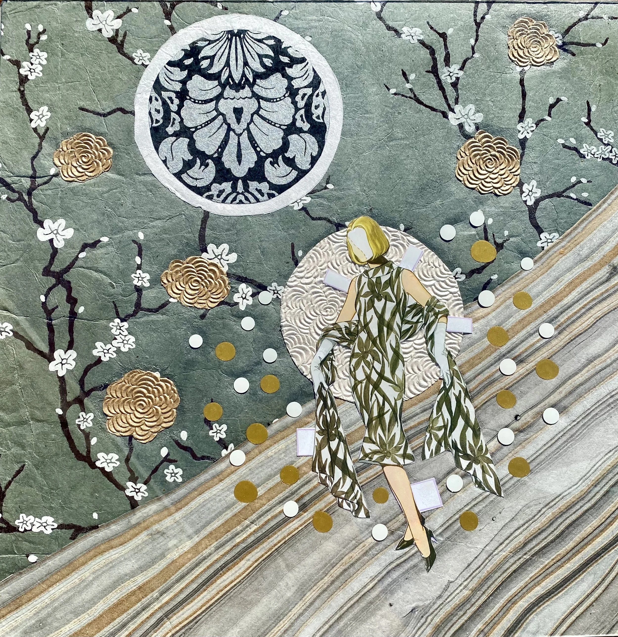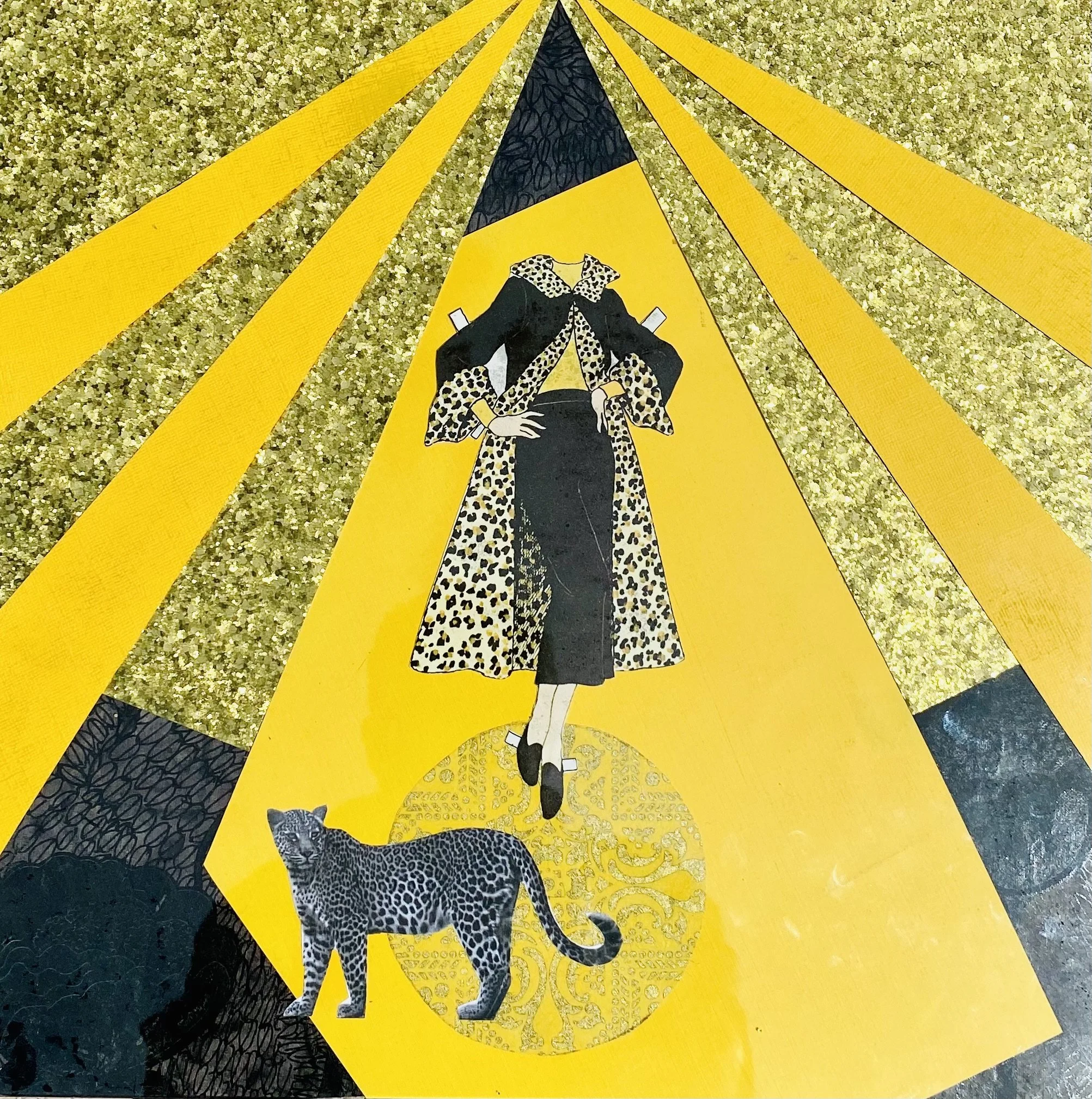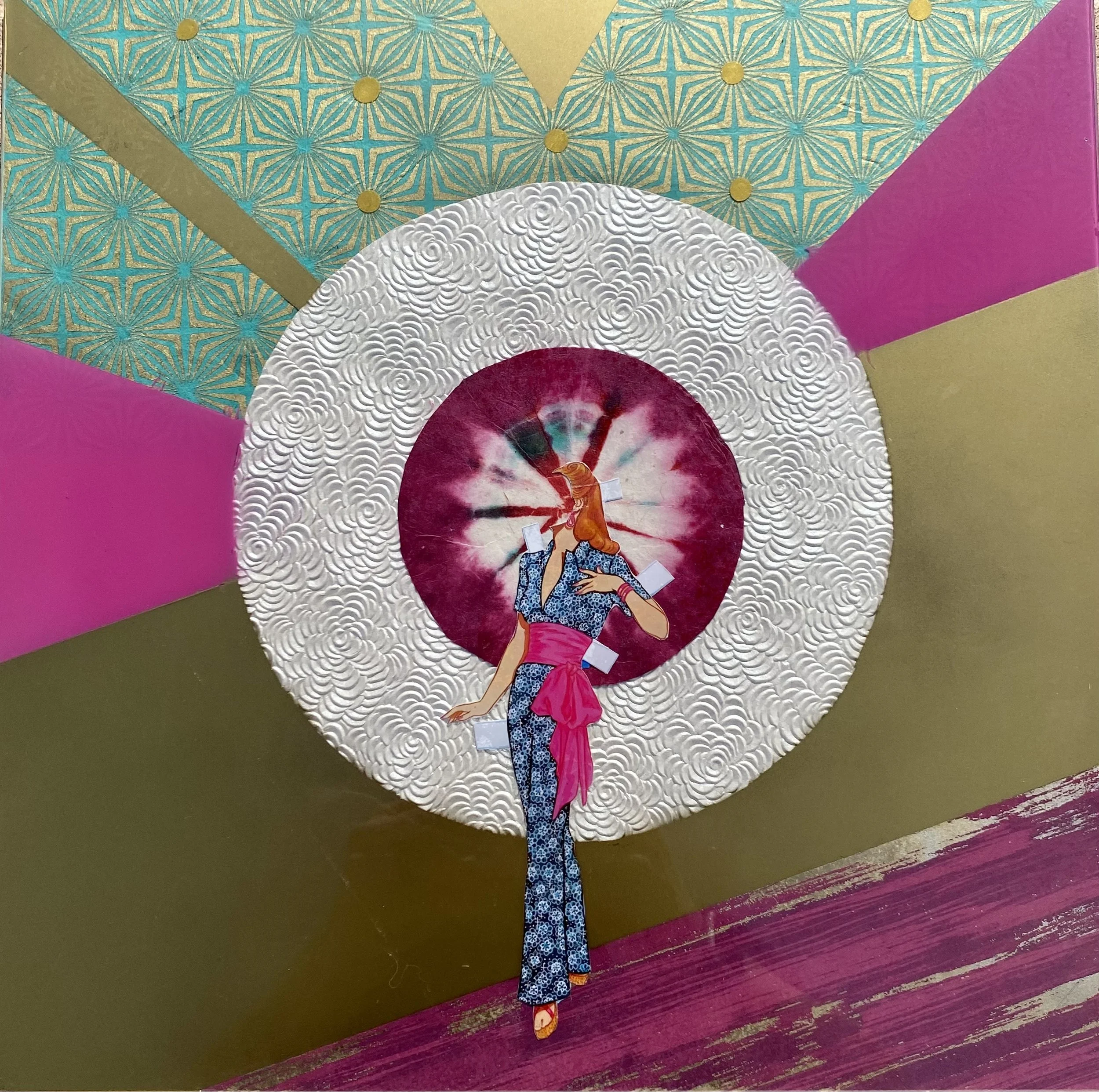 ACRYLIC AND COLLAGE ON GLASS 14”14”