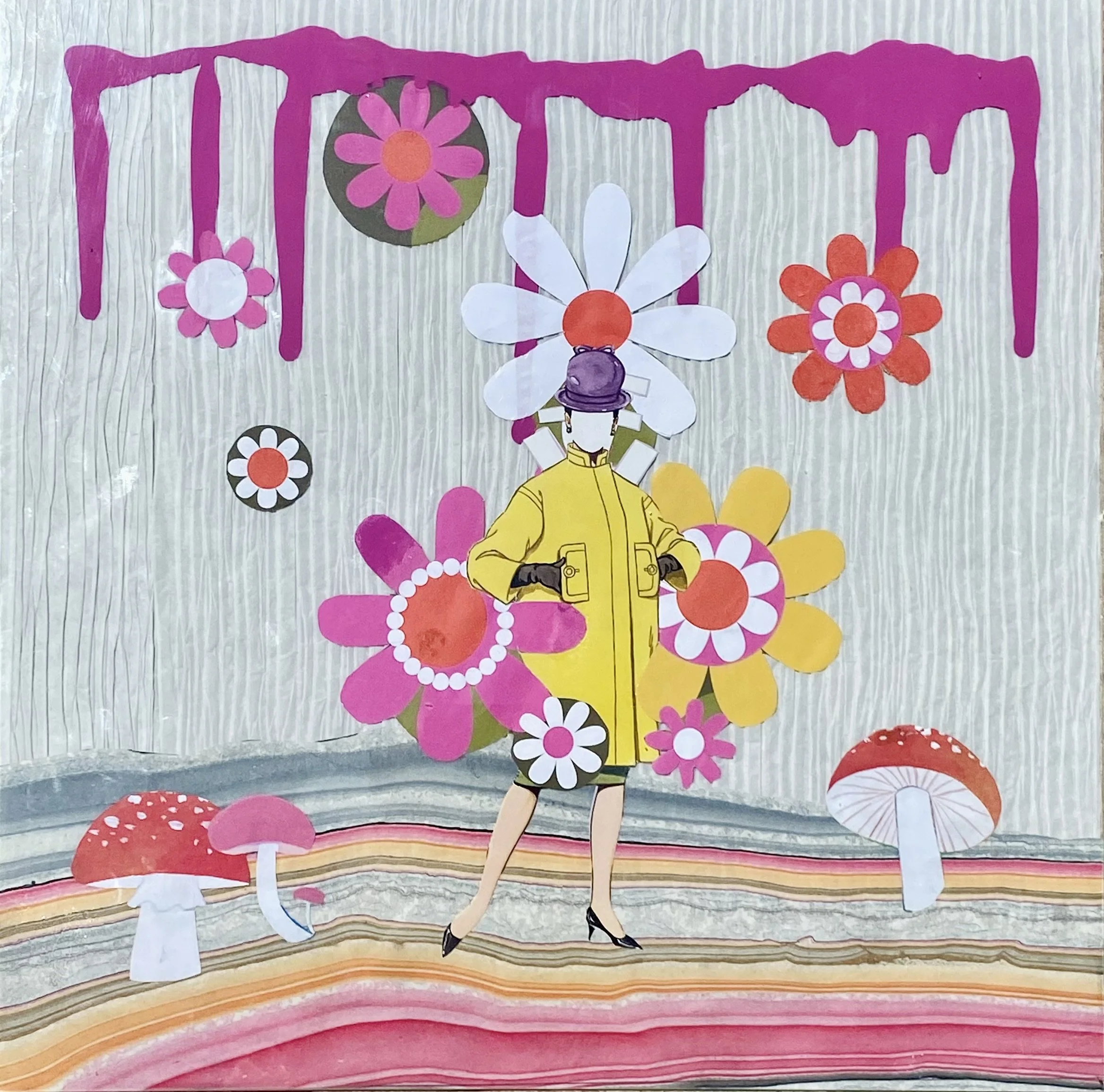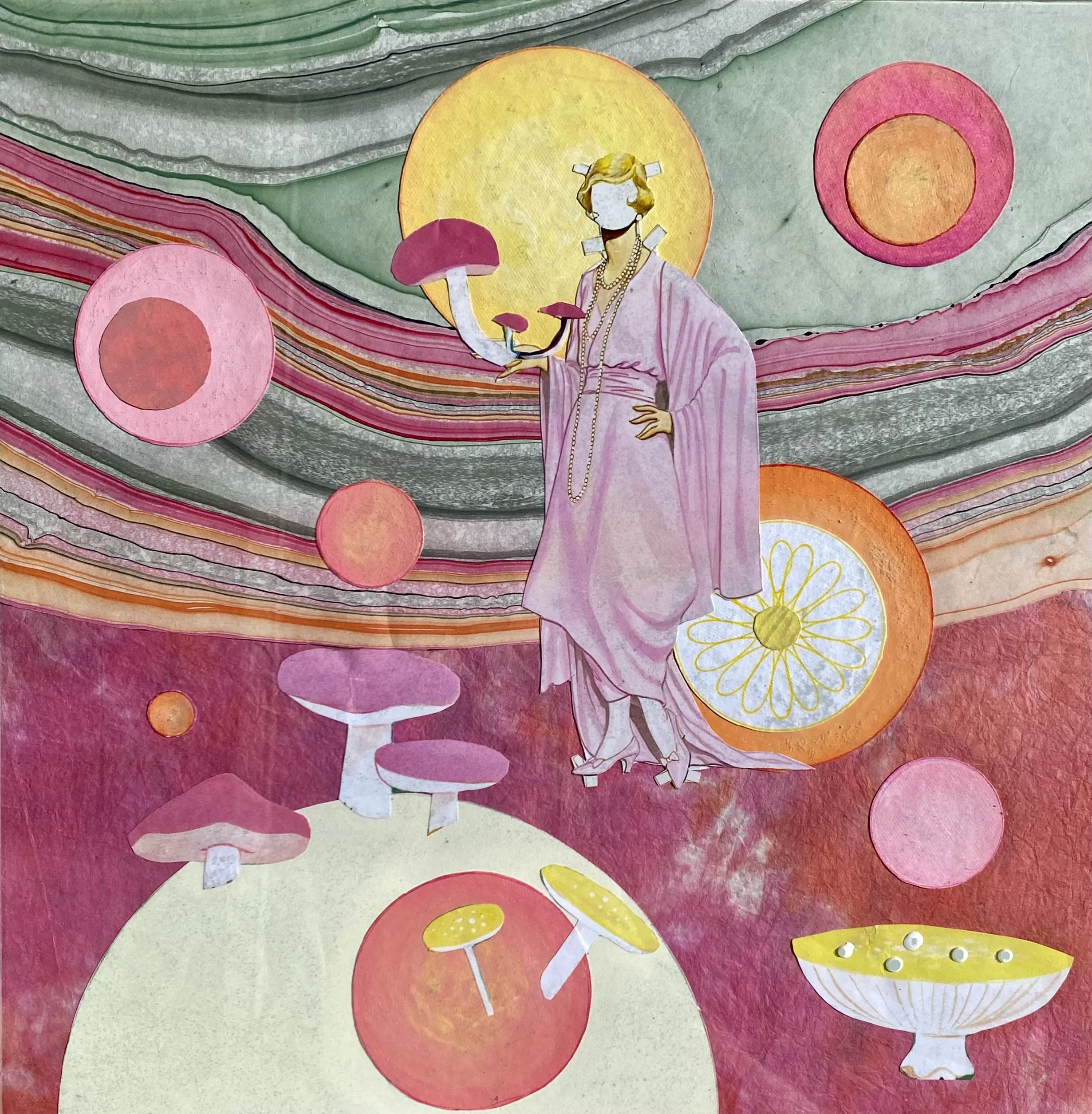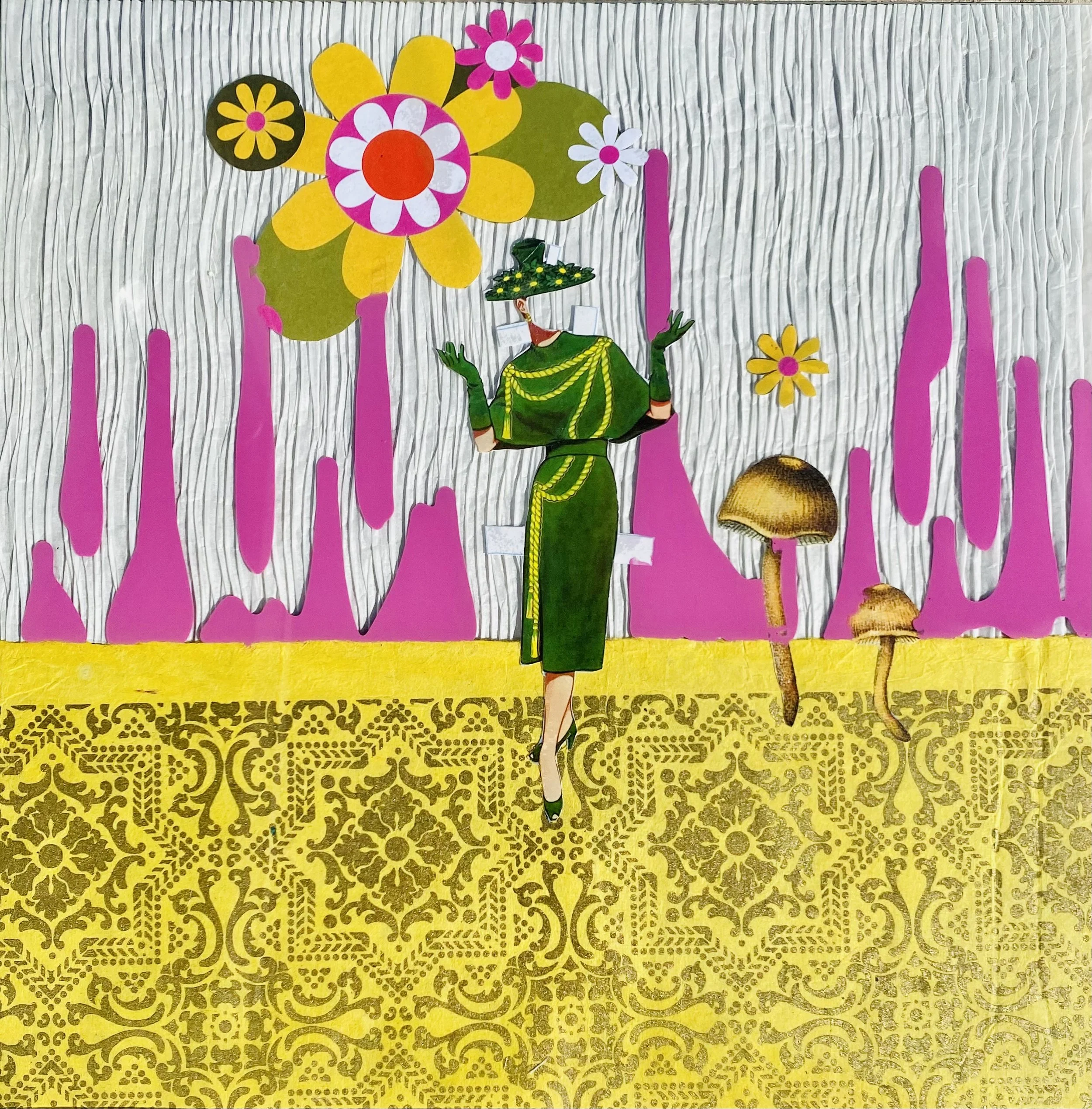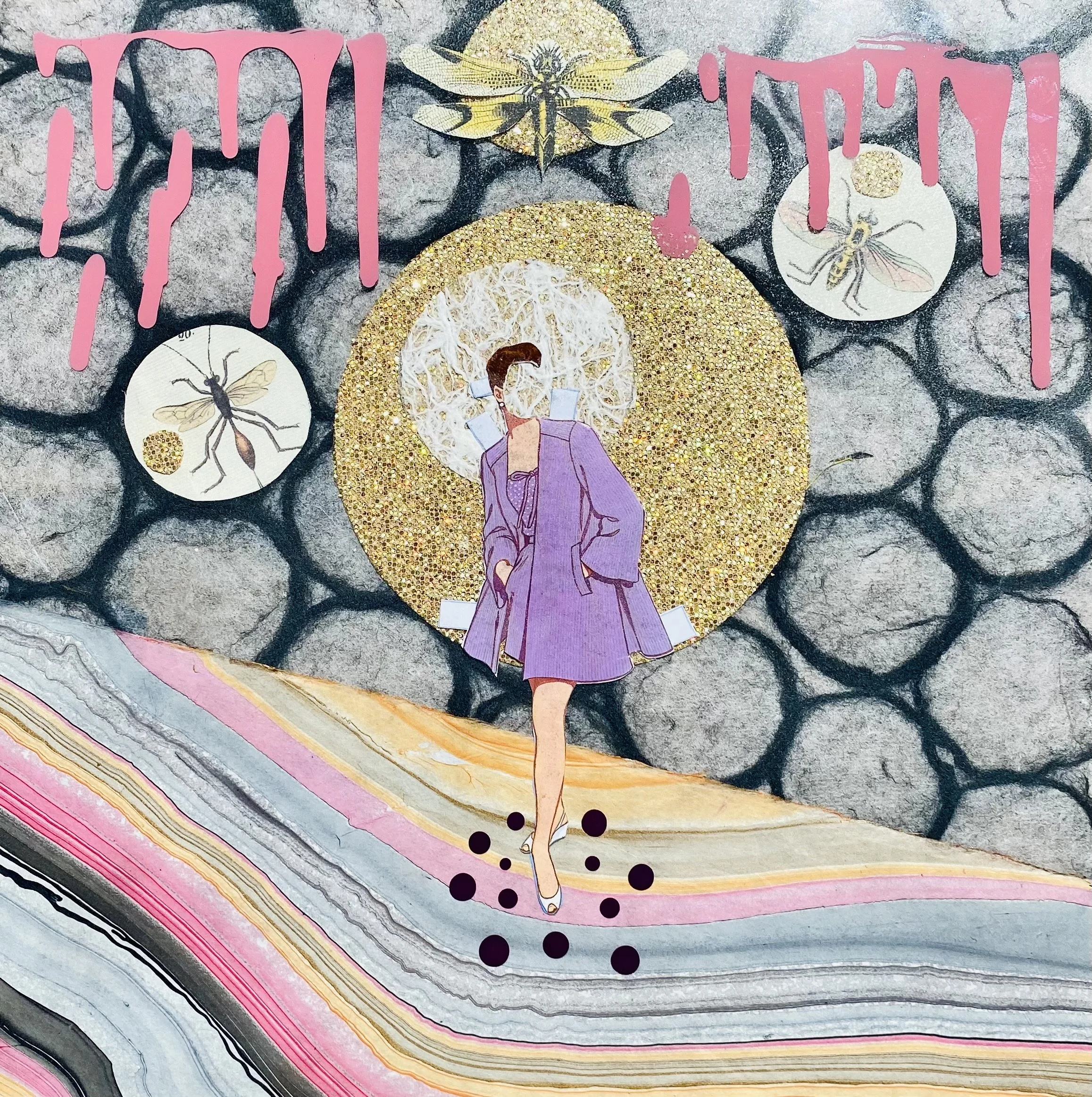 ACRYLIC AND COLLAGE ON GLASS 14”14”